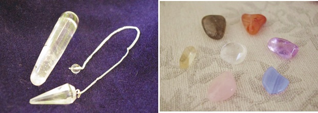 〈左〉 ペンジュラム(振り子)とクリスタルワンド(杖)、〈右〉 ワンコに必要な7つのクリスタル